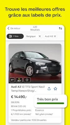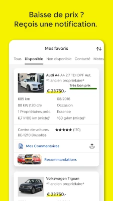 Restez constamment informé grâce aux alertes personnalisées d'AutoScout24. Recevez des notifications instantanées sur les nouvelles offres correspondant à vos critères, les baisses de prix exceptionnelles et les mises à jour concernant vos favoris. Enregistrez et comparez vos véhicules préférés, et partagez-les aisément avec vos proches. La plateforme AutoScout24 vous permet également d'interagir directement avec des professionnels de l'automobile dont les avis sont authentifiés, garantissant ainsi une confiance et une transparence totales à chaque étape de votre parcours.