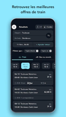 Votre compagnon multimodal rassemble toutes les solutions de transport en un seul point d'accès. Accédez aux itinéraires optimaux intégrant trains (TGV INOUI, OUIGO, Eurostar, TER, Intercités), réseaux de transports en commun (métro, bus, tram, RER, Transilien, RATP en Île-de-France et dans 28 métropoles), autocars (Flixbus, Blablacar Bus) et covoiturage (Blablacar). Profitez de fonctionnalités intelligentes pour ne rien manquer : alertes de prix, de disponibilité ou de train complet, et la possibilité de poser une option sur un billet pour en bloquer le tarif, vous garantissant flexibilité et sérénité.